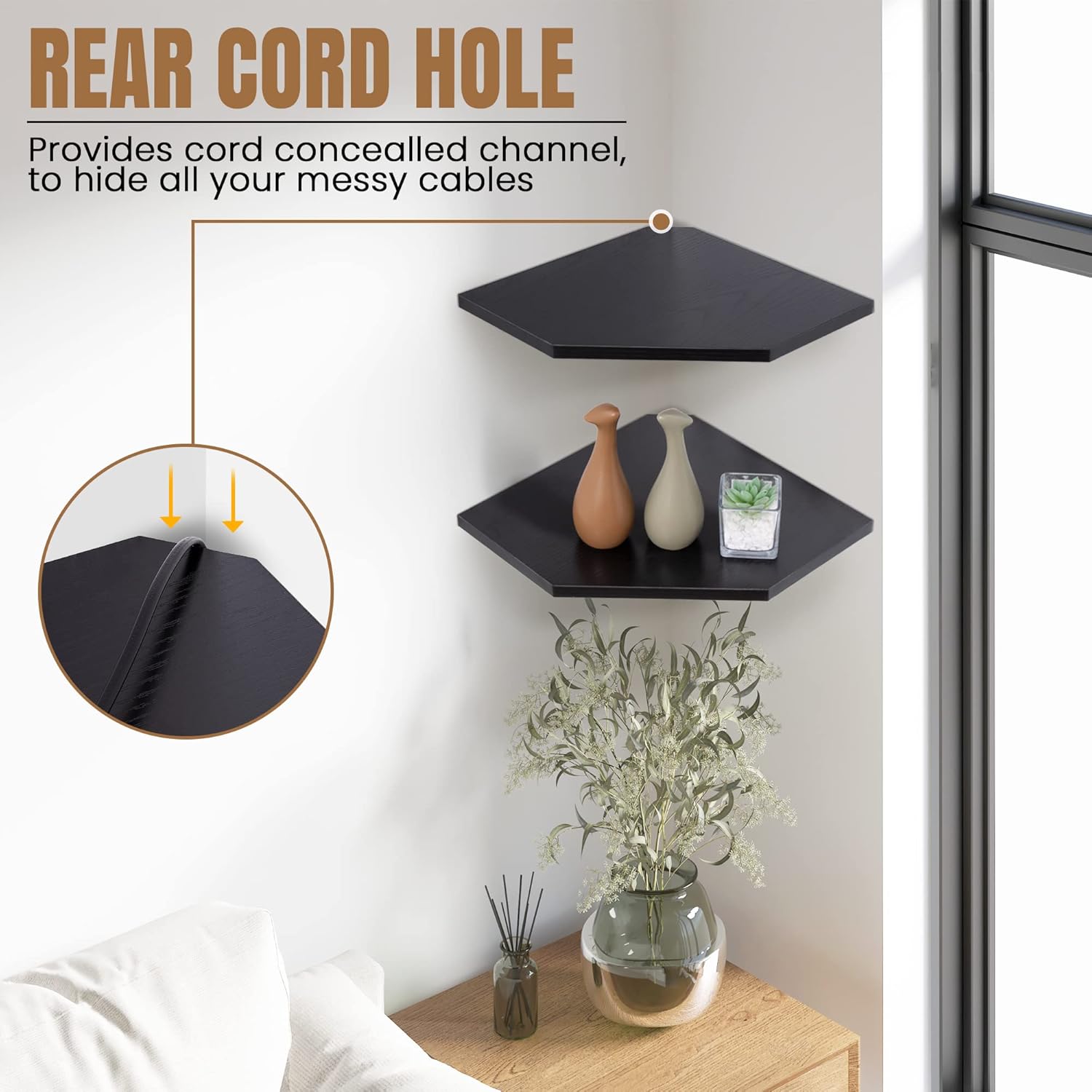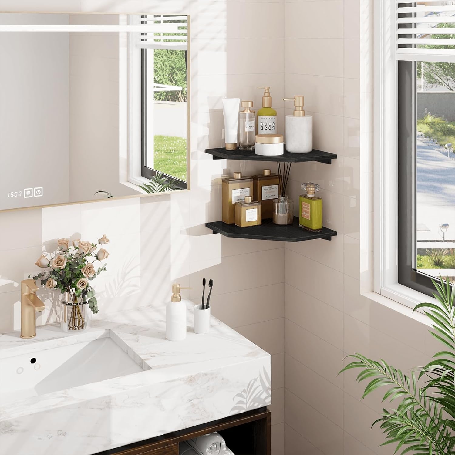 - 【Sturdy Corner Floating Shelves】 Our Set of 2 Wooden Corner Shelf Wall Mounts are crafted with premium quality, heavy-duty composite wood making them incredibly durable, mildly waterproof, easy to wipe clean, and environmentally friendly. These corner shelves have been designed to withstand high weight-bearing capacity and can support up to 22 pounds for each tier, making them the perfect solution for all your storage needs