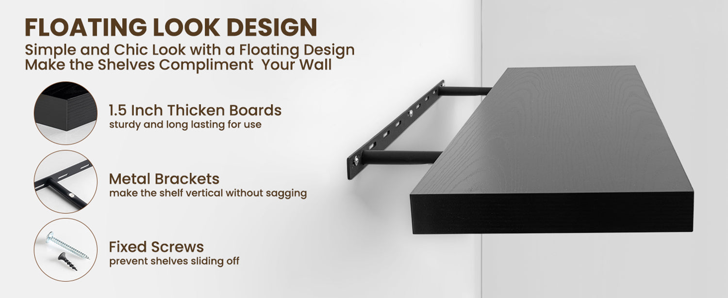 - INVISIBLE BRACKET SHELVES: With a hidden bracket design, these black wall mounted shelves give the illusion of floating on any wall, adding a contemporary touch to your decor.