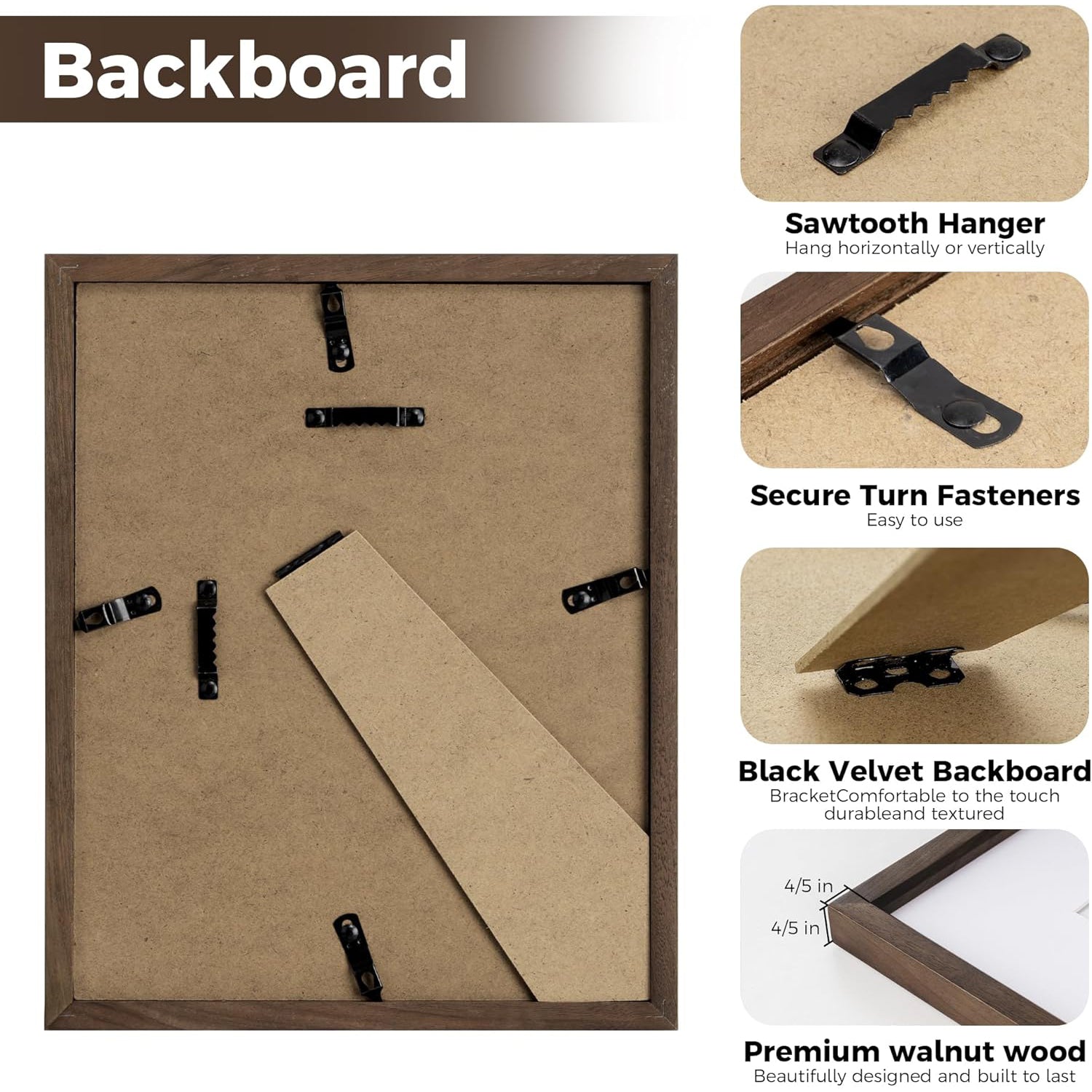 【Effortless Style & Functionality】Designed with convenience in mind, this walnut wood frame includes easy-turn buttons and a durable cardboard backing to securely hold your artwork. Whether hung vertically or horizontally, it’s perfect for displaying family portraits, art prints, diplomas, or inspirational posters on your wall.
