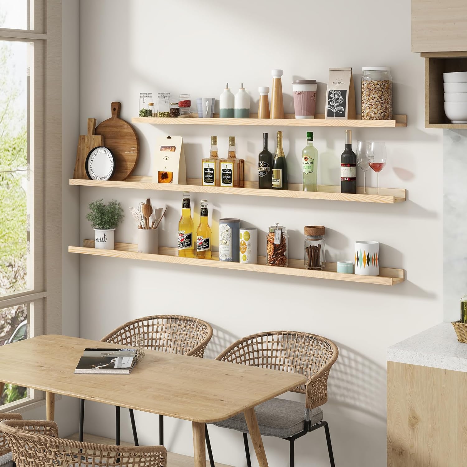 - Solid Pine Wood Shelves: Experience the beauty of natural wood with our solid pine picture ledge wall shelves. Each natural shelf is carefully chosen for its unique wood knots and texture, adding a rustic and glamorous touch to your living space. The hand-crafted finish ensures durability and a long life, making these shelves a timeless addition to any home.