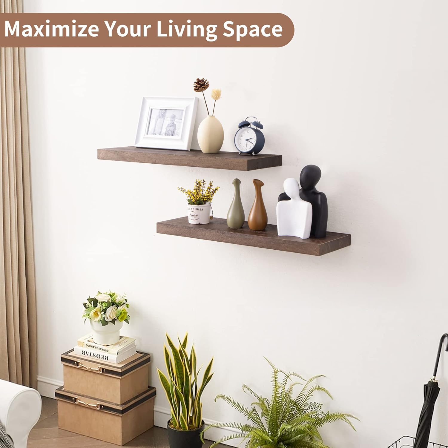 Versatile Home Decor: Whether in the living room, bathroom, or kitchen, these walnut floating shelves are ideal for showcasing photo frames, small plants, or storing essentials like toiletries and condiments. Their multi-functional design complements a variety of spaces with ease.