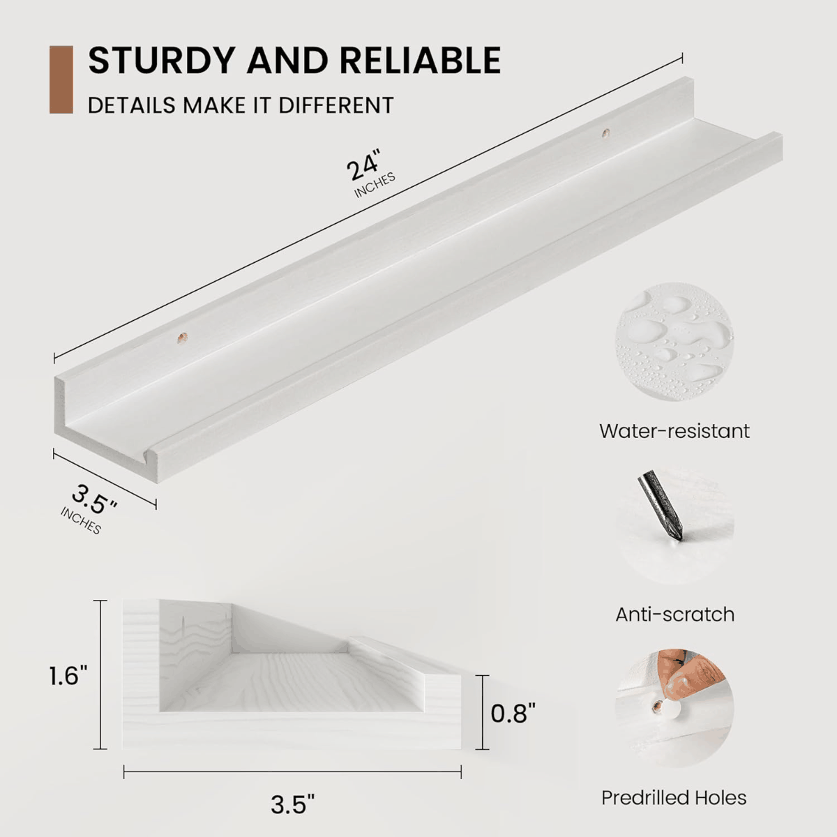 【Ultra-Slim 3.5" Deep Ledge – Secure & Sleek】Designed with a narrow 3.5-inch profile, these space-saving floating ledges securely hold frames, small plants, or décor—even on slanted walls—without the risk of slipping. Pre-drilled 16-inch stud holes ensure a secure, wobble-free installation (mounting hardware and level included). The slim silhouette creates a clean, clutter-free aesthetic that suits Scandinavian, farmhouse, or minimalist interiors.