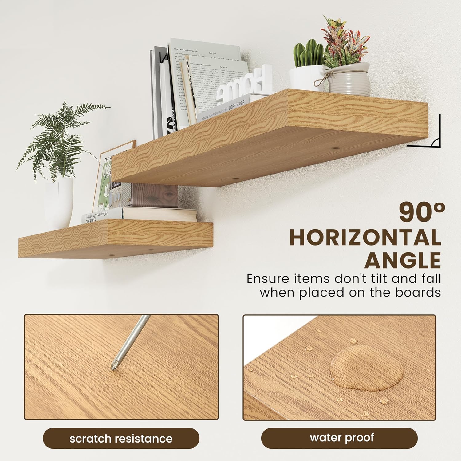 - Easy to Install: Come with all the installation hardware you need. We have a smart installation design. Thicken metal brackets help boards to be stable and load-bearing, vertical to the wall, and not sagging. The shelves have pre-drilled holes in the bottom to allow screws to secure the boards to the brackets to prevent them from slipping.