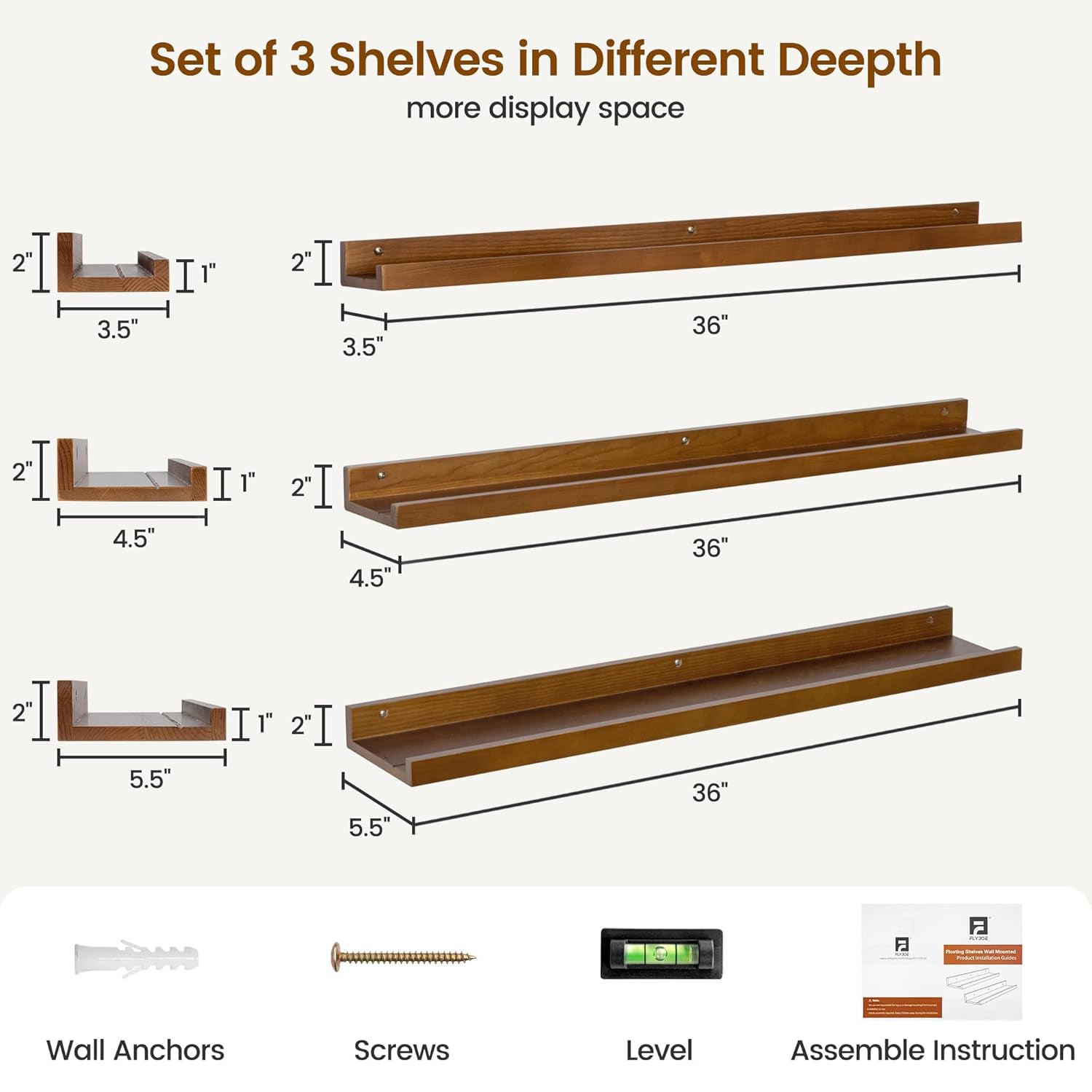- Large Storage Space Nursery Shelves: These wall shelves provide a great solution for organizing your nursery. This set comes with 3 packs, with dimensions of 36 inch wide, 3.5 inch/4.5 inch/5.5 inch deep x 2 inch height, making these shelves even more convenient to the wall to store books, toys, stuffed animals, and games.