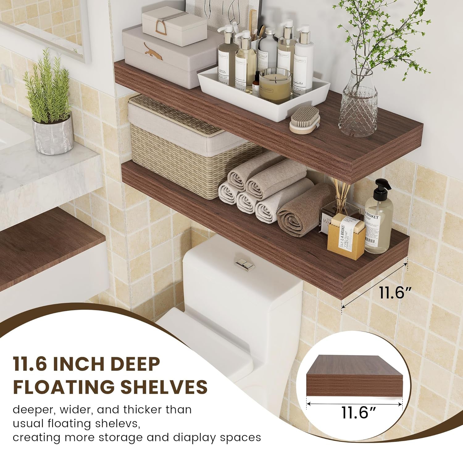 - Deeper&Thicker Shelf: Our walnut floating shelves measure 36 inch wide, 11.6 inch deep x 2 inch height, deeper and thicker than usual wall shelves, which create more storage and display space for your home.