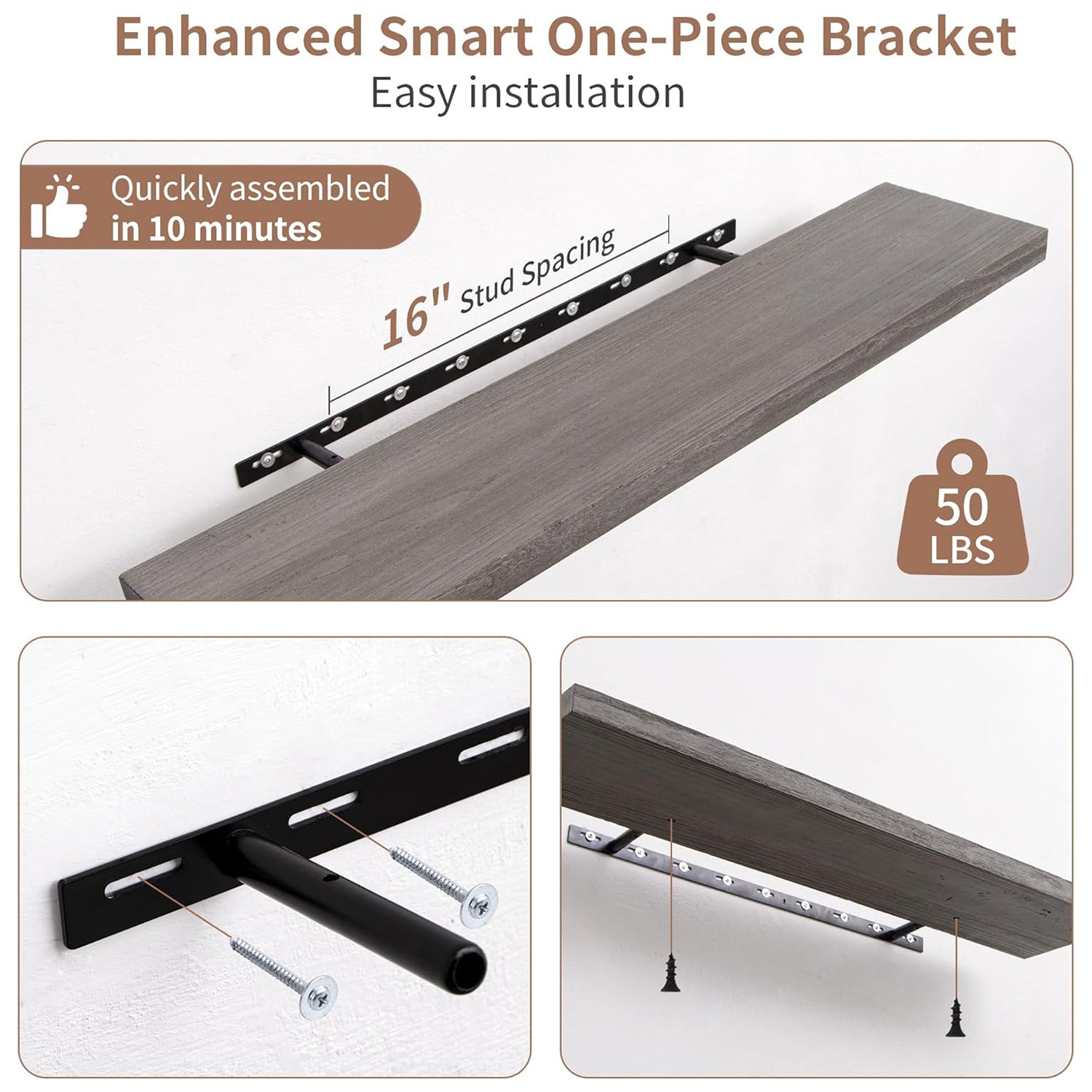 Innovative Mounting System: Equipped with a robust hidden bracket, these grey floating shelves are designed for secure installation into wall studs, supporting up to 45 lbs per shelf. The flush mount design conceals the brackets for a seamless look, while bottom screws keep the shelves firmly in place.