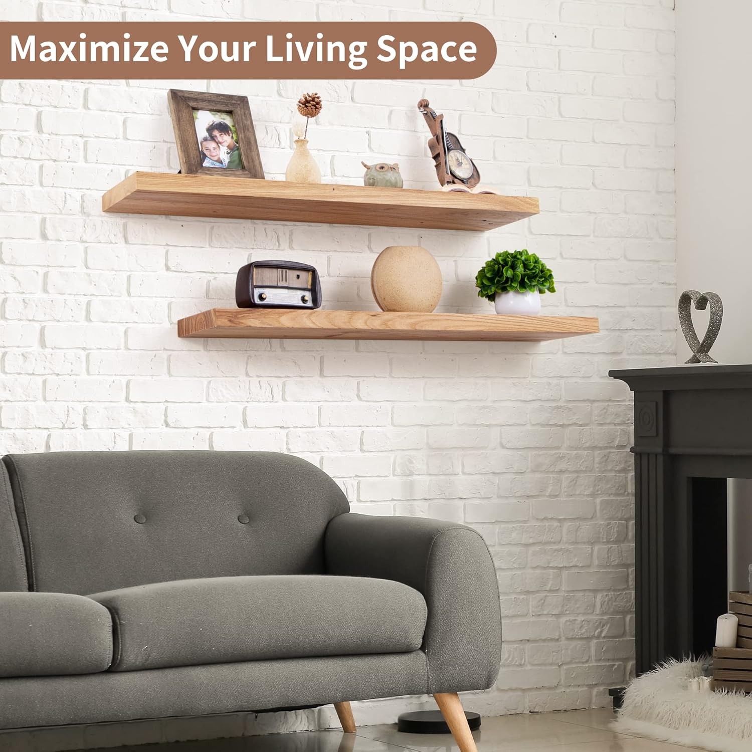 Deeper and Thicker Build: With a depth of 8 inches and a thickness of 1.5 inches, these natural floating shelves offer more space and sturdiness compared to standard floating shelves. Perfect for displaying photos, books, and decorative items, they combine style with practicality for any room.