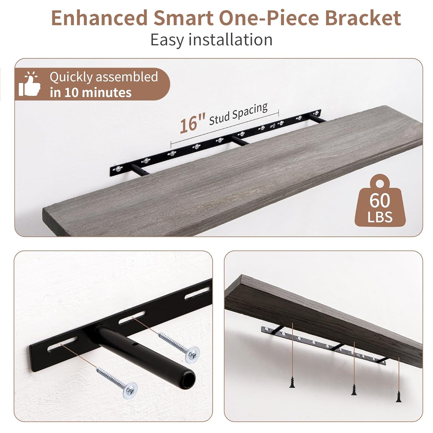 Innovative Mounting System: Equipped with a robust hidden bracket, these grey floating shelves are designed for secure installation into wall studs, supporting up to 45 lbs per shelf. The flush mount design conceals the brackets for a seamless look, while bottom screws keep the shelves firmly in place.