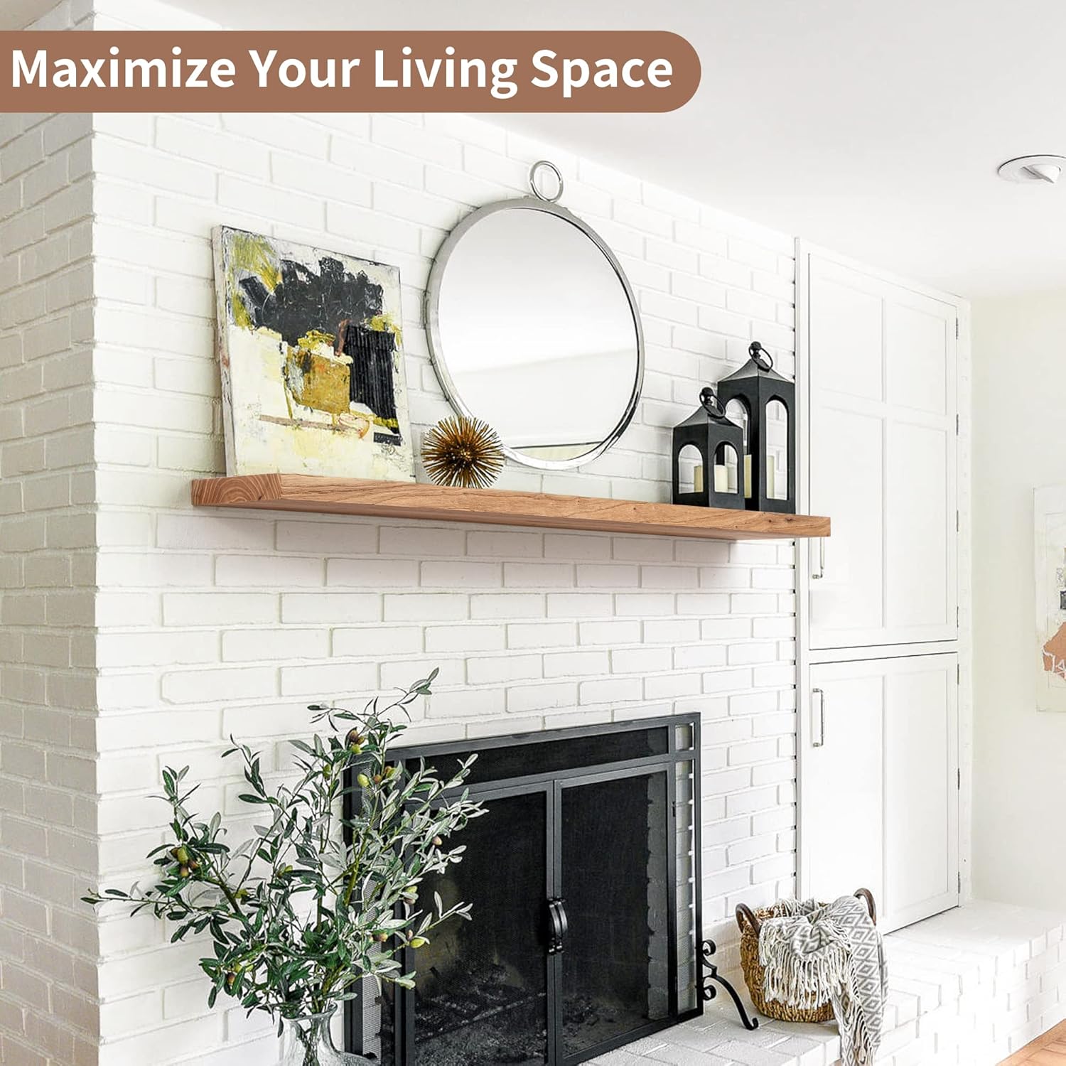 Innovative Mounting System: Equipped with a robust hidden bracket, natural floating shelves are designed for secure installation into wall studs, supporting up to 45 lbs per shelf. The flush mount design conceals the brackets for a seamless look, while bottom screws keep the shelves firmly in place.