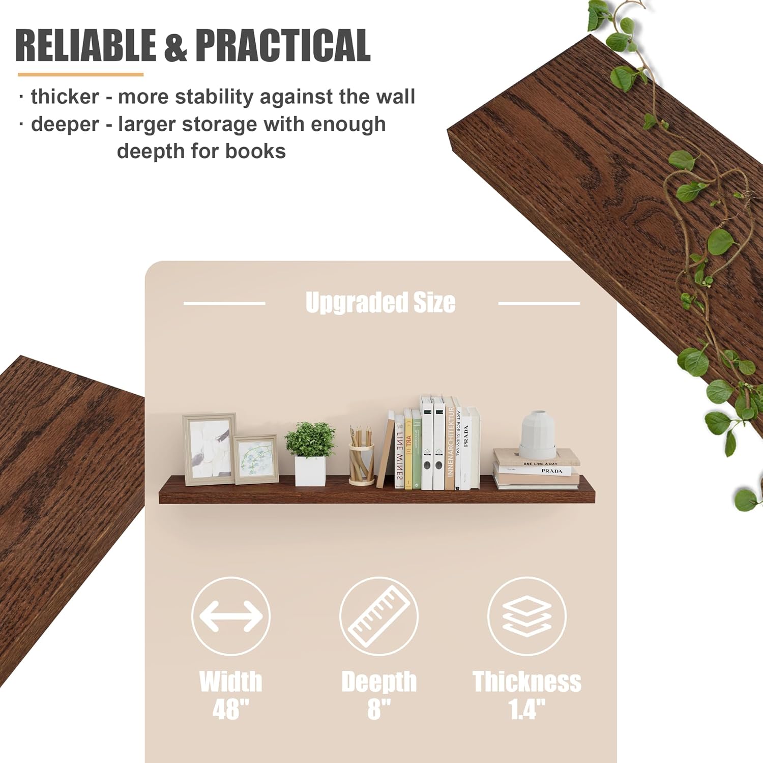 - [8" DEEP FLOATING SHELVES] At 8 inches in depth and 1.6 inches in thickness, these shelves are wider and sturdier than traditional floating shelves. Perfect for displaying items such as photos, DVDs, books, toys, and knickknacks, these shelves beautifully showcase your belongings.