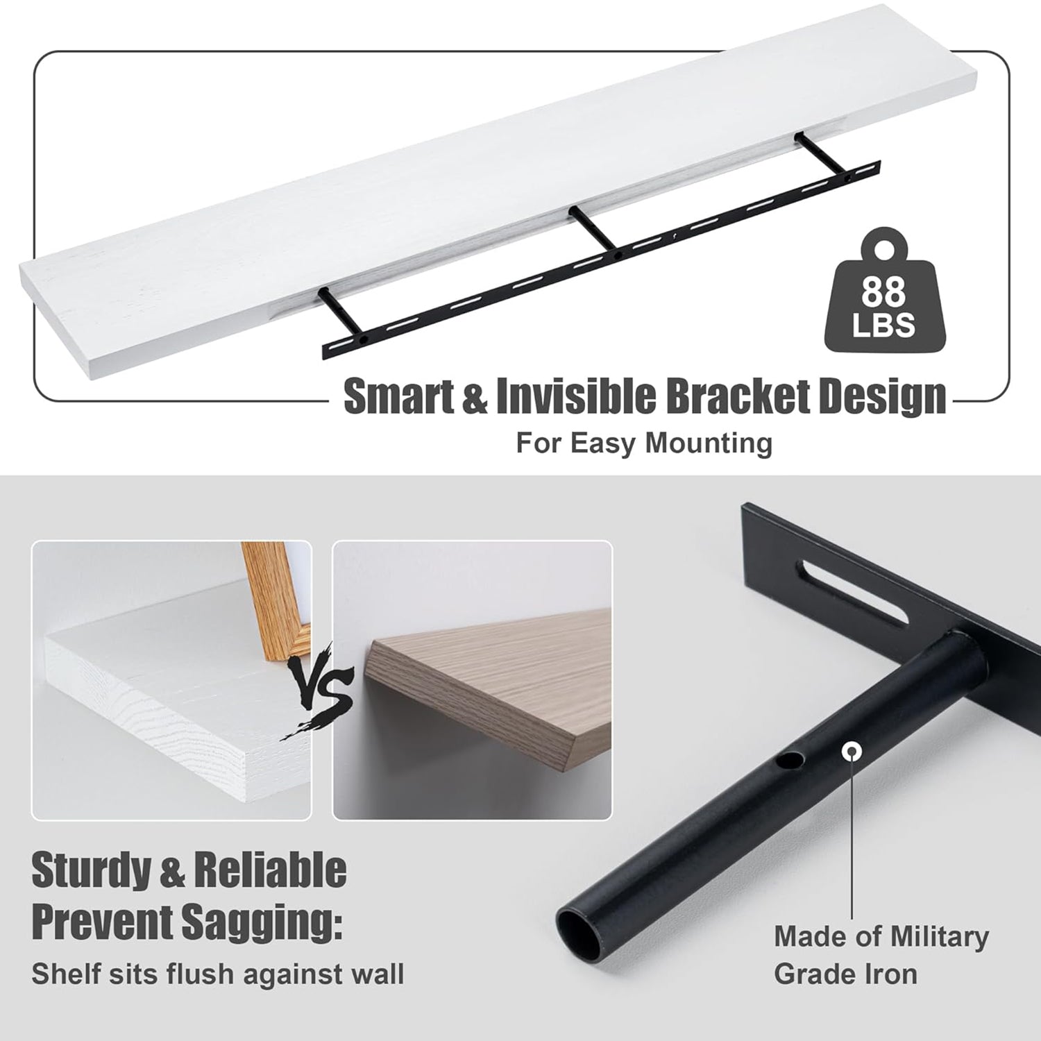 - [SMART MOUNTING DESIGN] With a heavy-duty hidden bracket that installs into wall studs, these shelves can hold up to 66/77/88 lbs each. The flush mount design ensures that the metal brackets are invisible after installation, while screws at the bottom secure the shelves from sliding off.