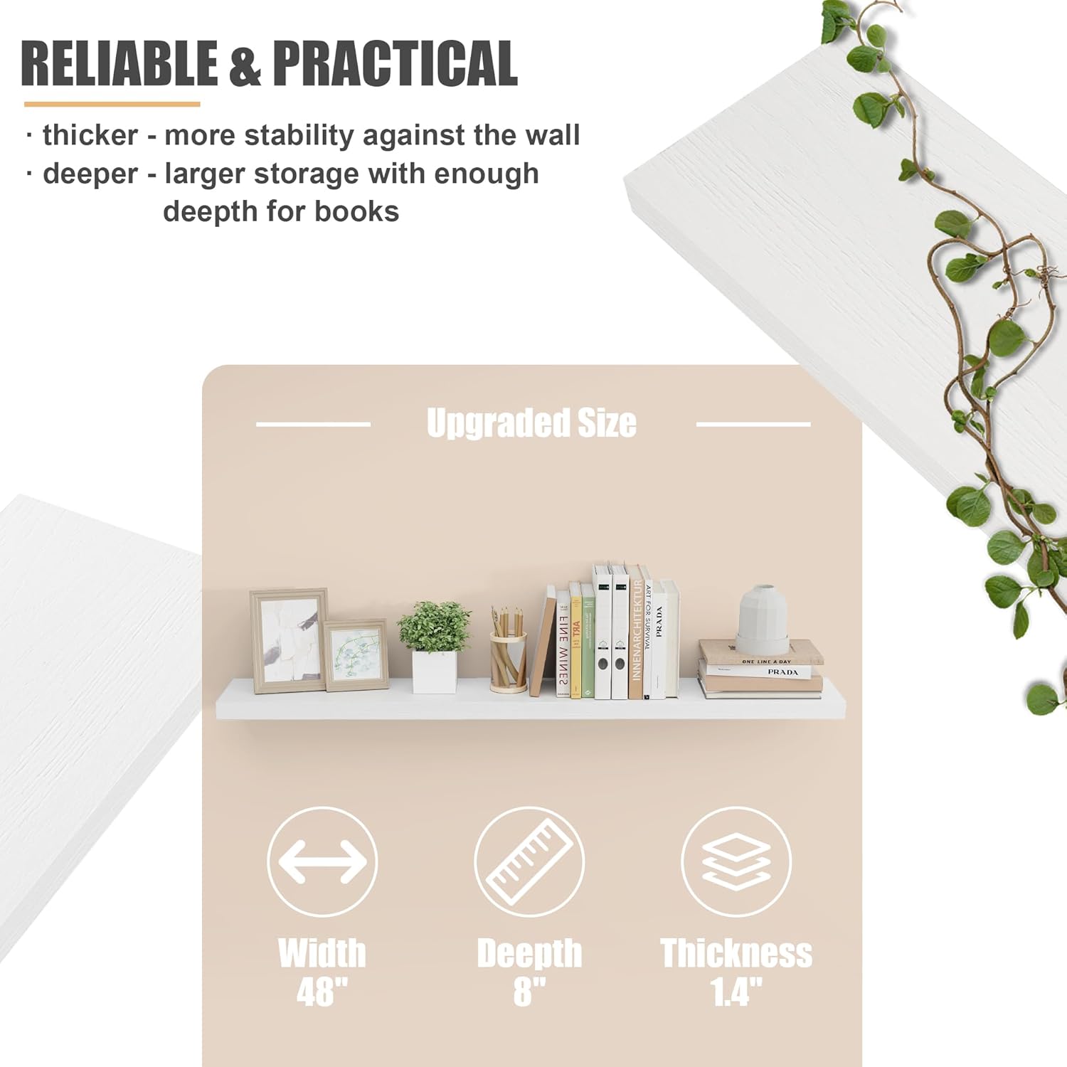- [8" DEEP FLOATING SHELVES] At 8 inches in depth and 1.6 inches in thickness, these shelves are wider and sturdier than traditional floating shelves. Perfect for displaying items such as photos, DVDs, books, toys, and knickknacks, these shelves beautifully showcase your belongings.