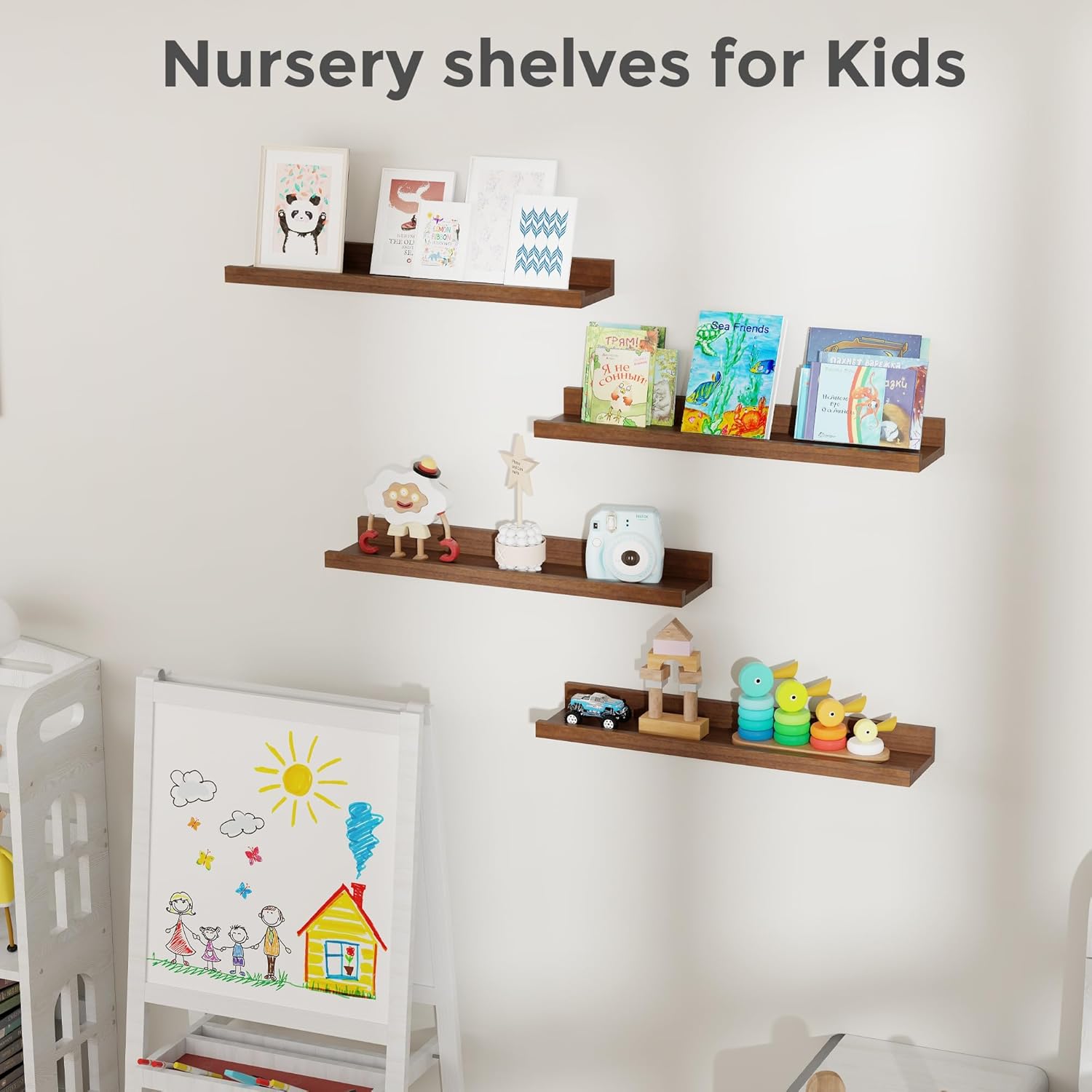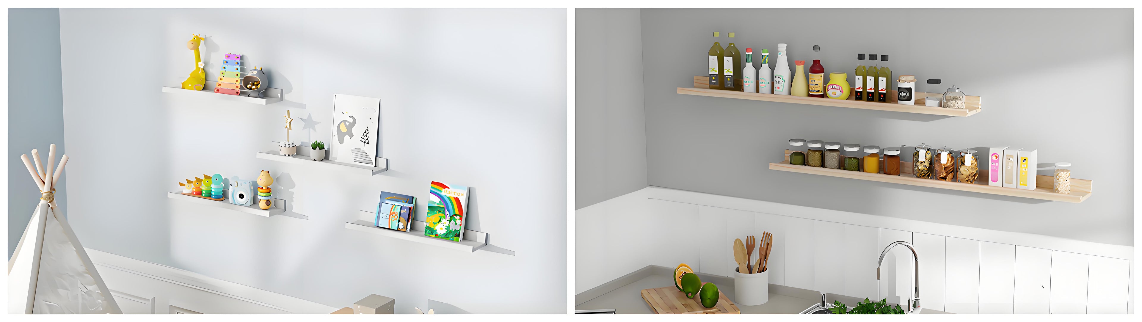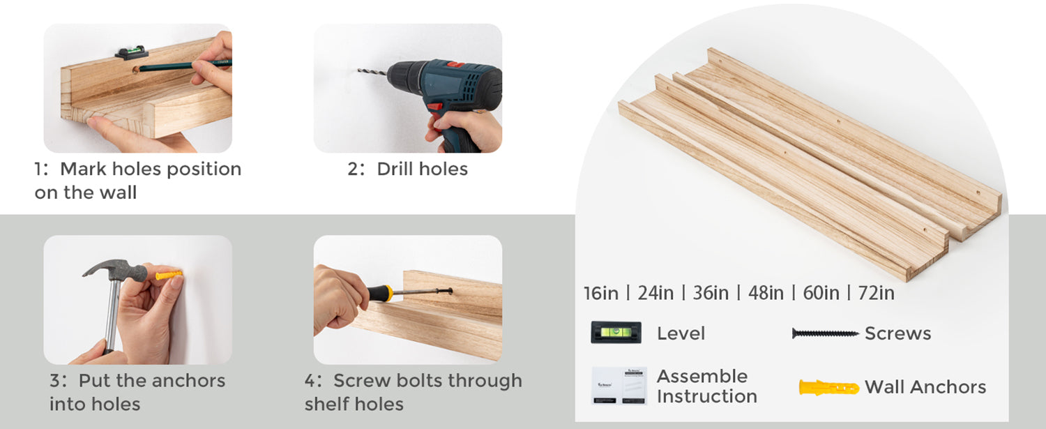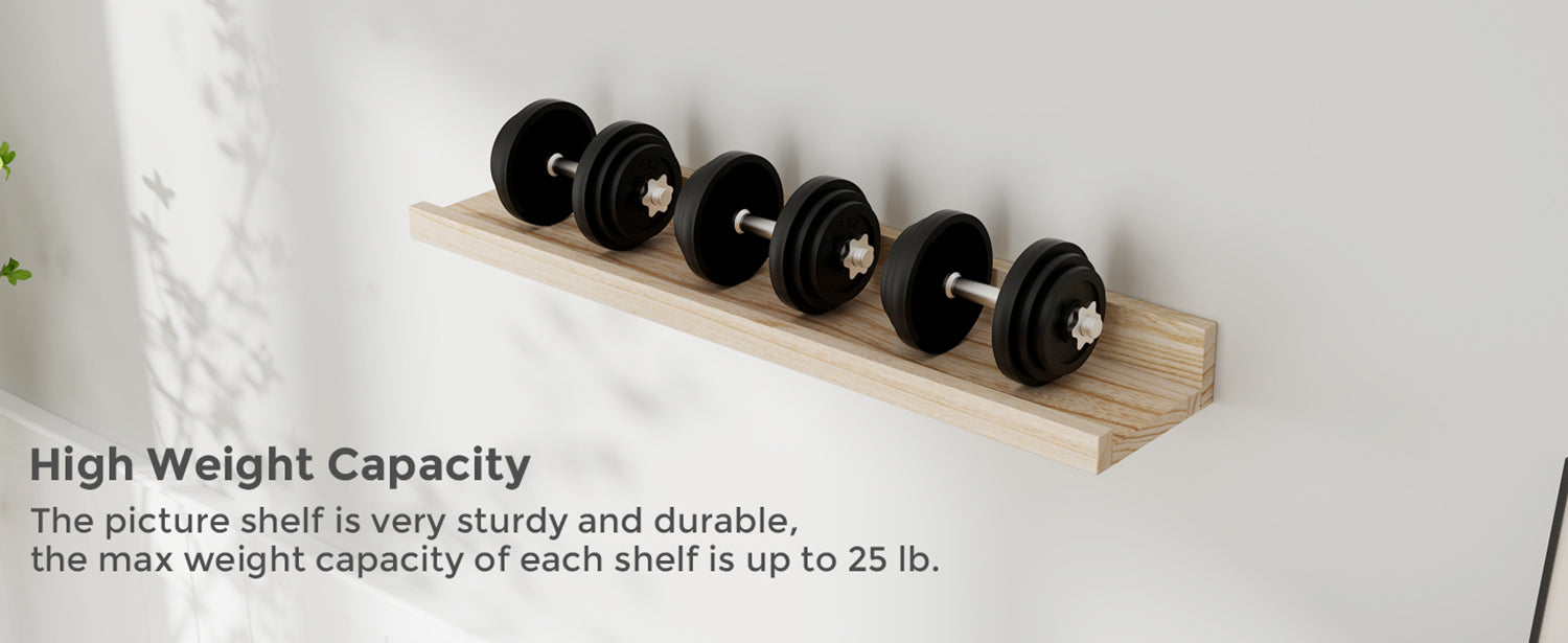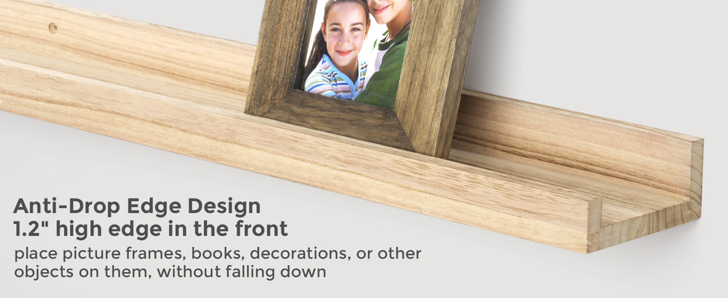 - 【Solid Wood Nursery Shelves】The wall shelves are crafted from Paulownia wood which are lightweight yet proportionately strong, sustainable real wood. The picture ledge wall shelf is in several sizes to meet your different needs and is such an easy way to display photos without making lots of holes in your walls. They come fully assembled and all mounting hardware is included in the package.
