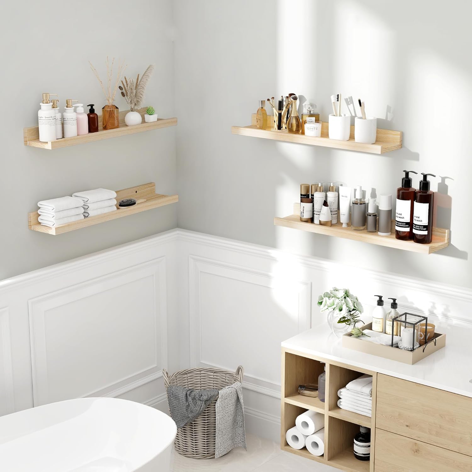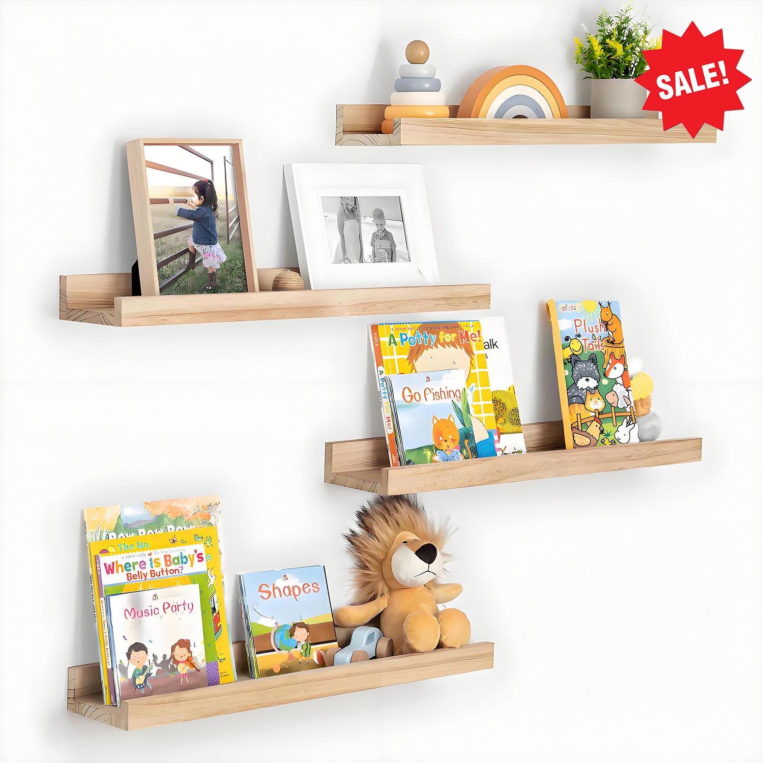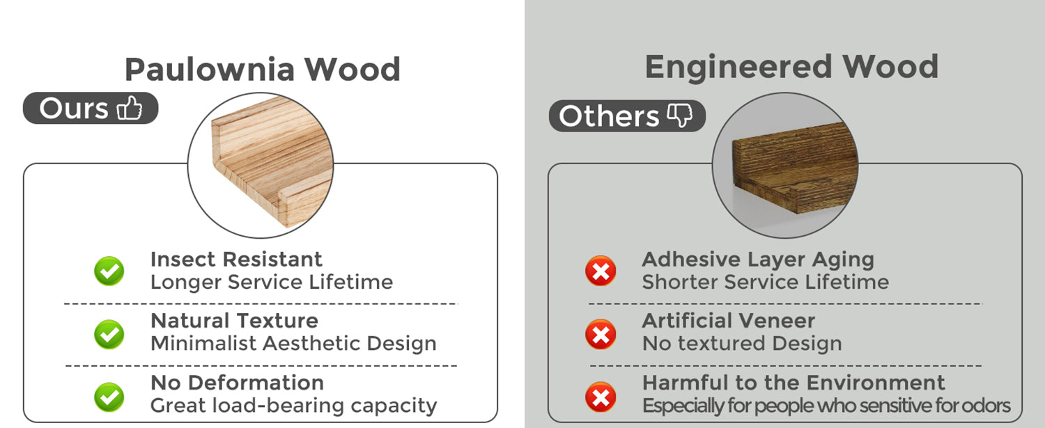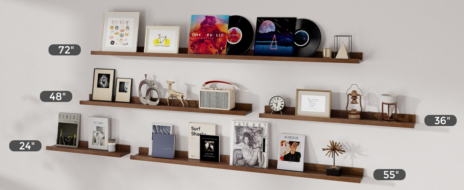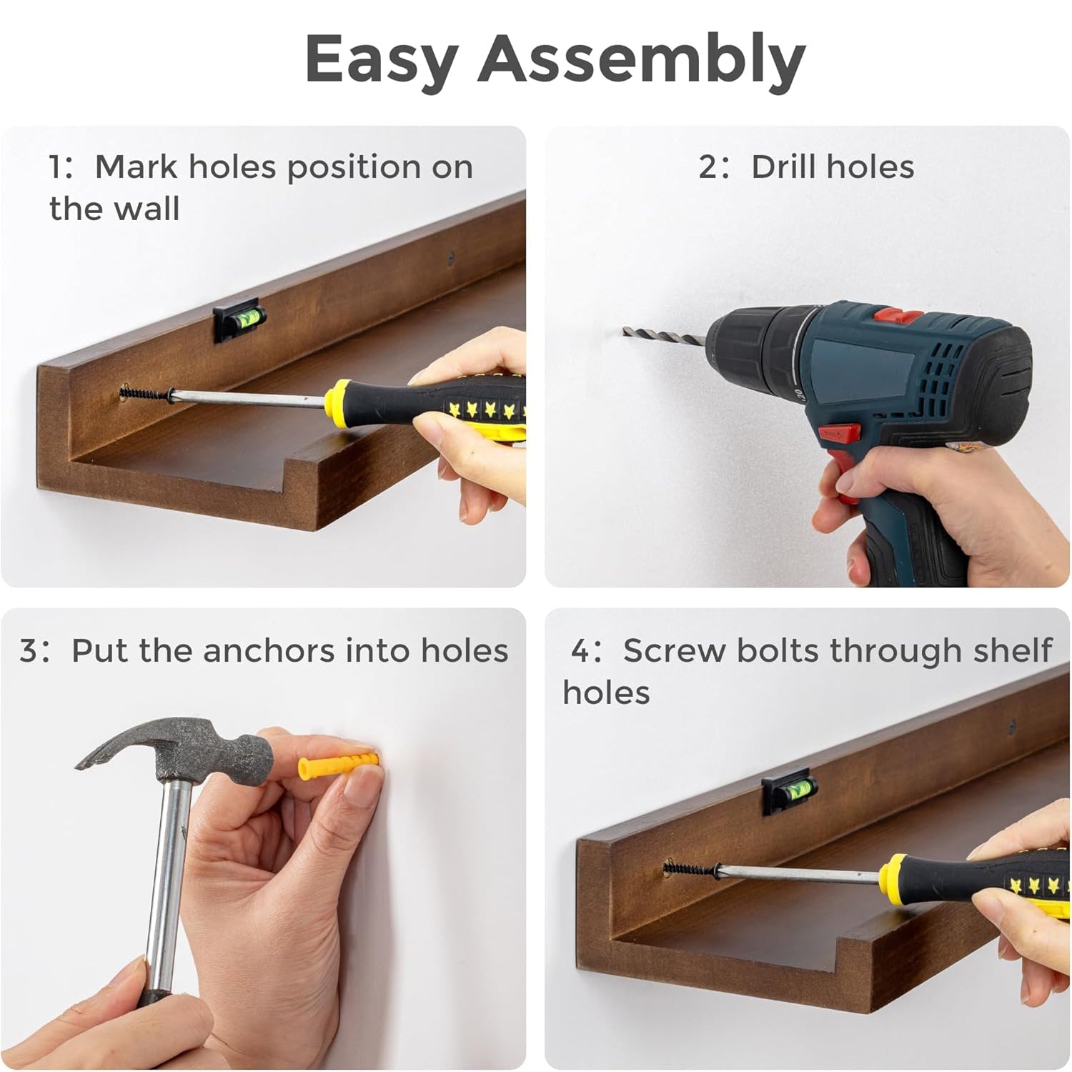 - 【Solid Wood Nursery Shelves】The wall shelves are crafted from Paulownia wood which are lightweight yet proportionately strong, sustainable real wood. The picture ledge wall shelf is in several sizes to meet your different needs and is such an easy way to display photos without making lots of holes in your walls. They come fully assembled and all mounting hardware is included in the package.