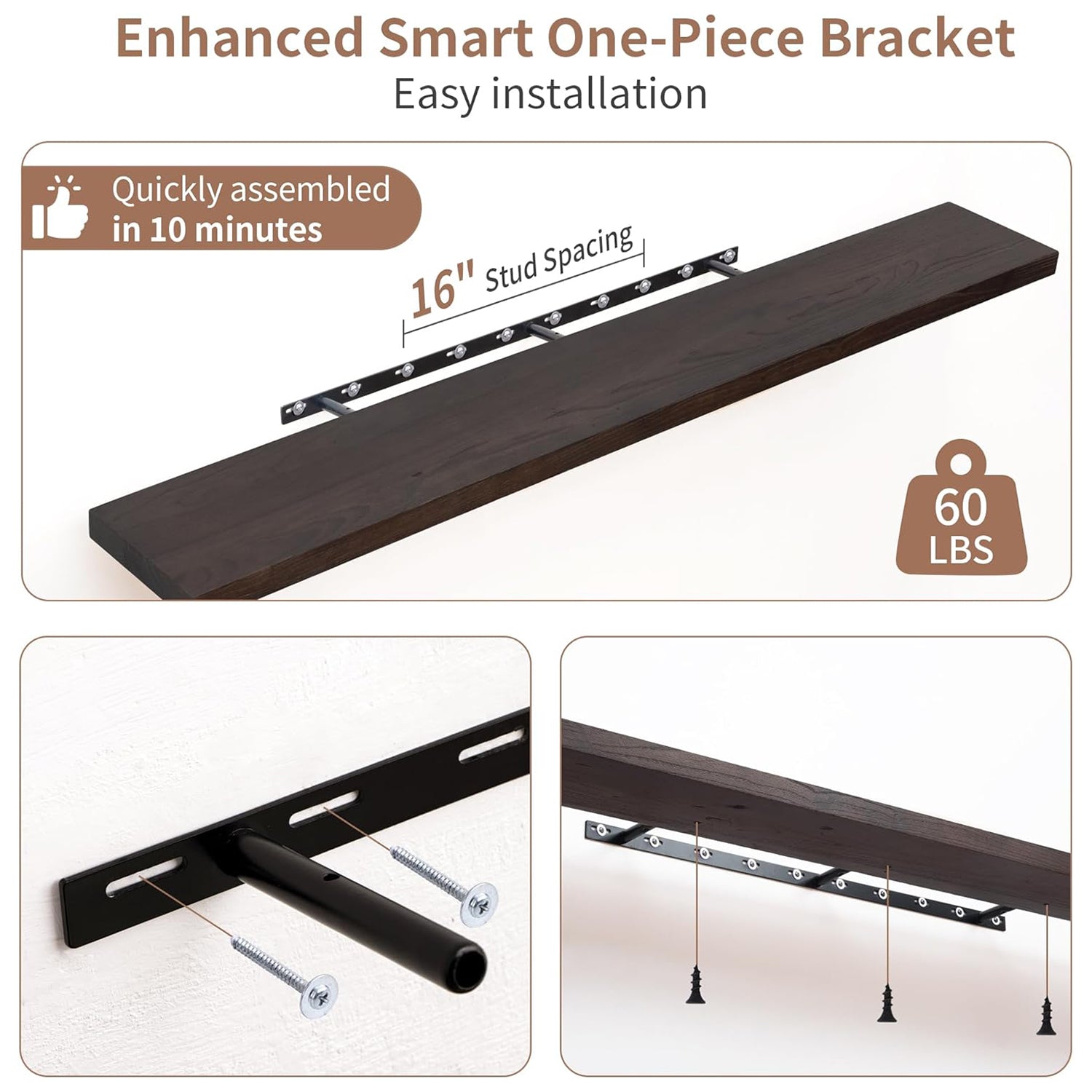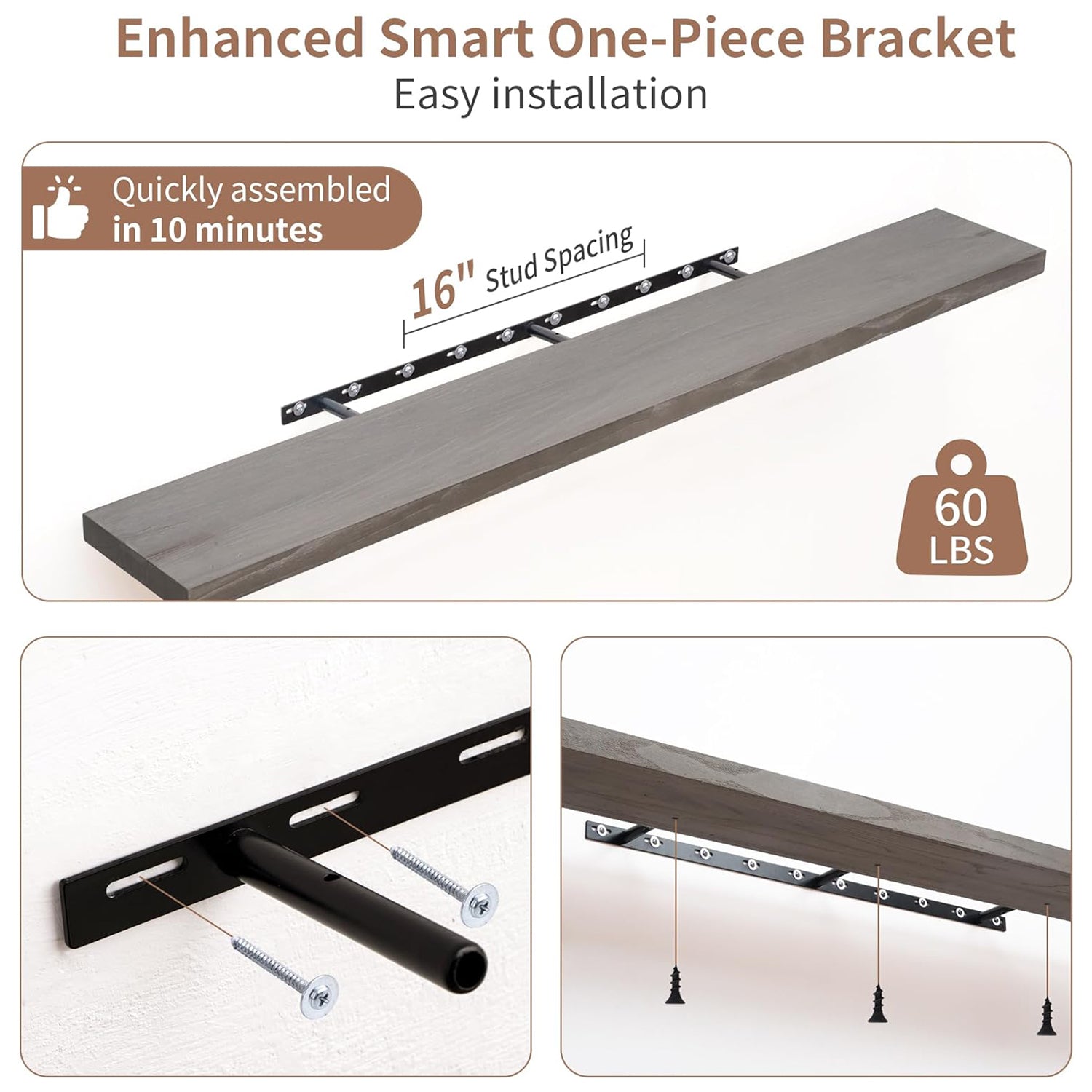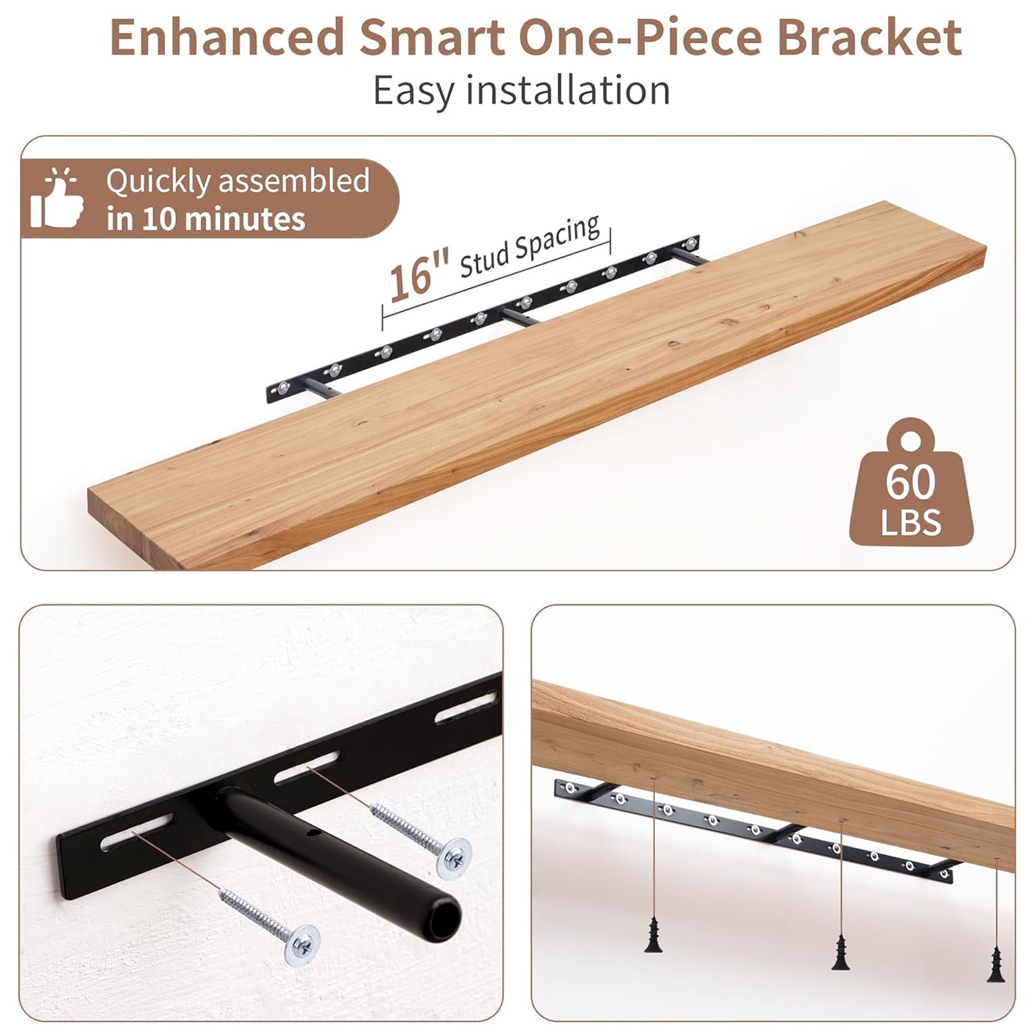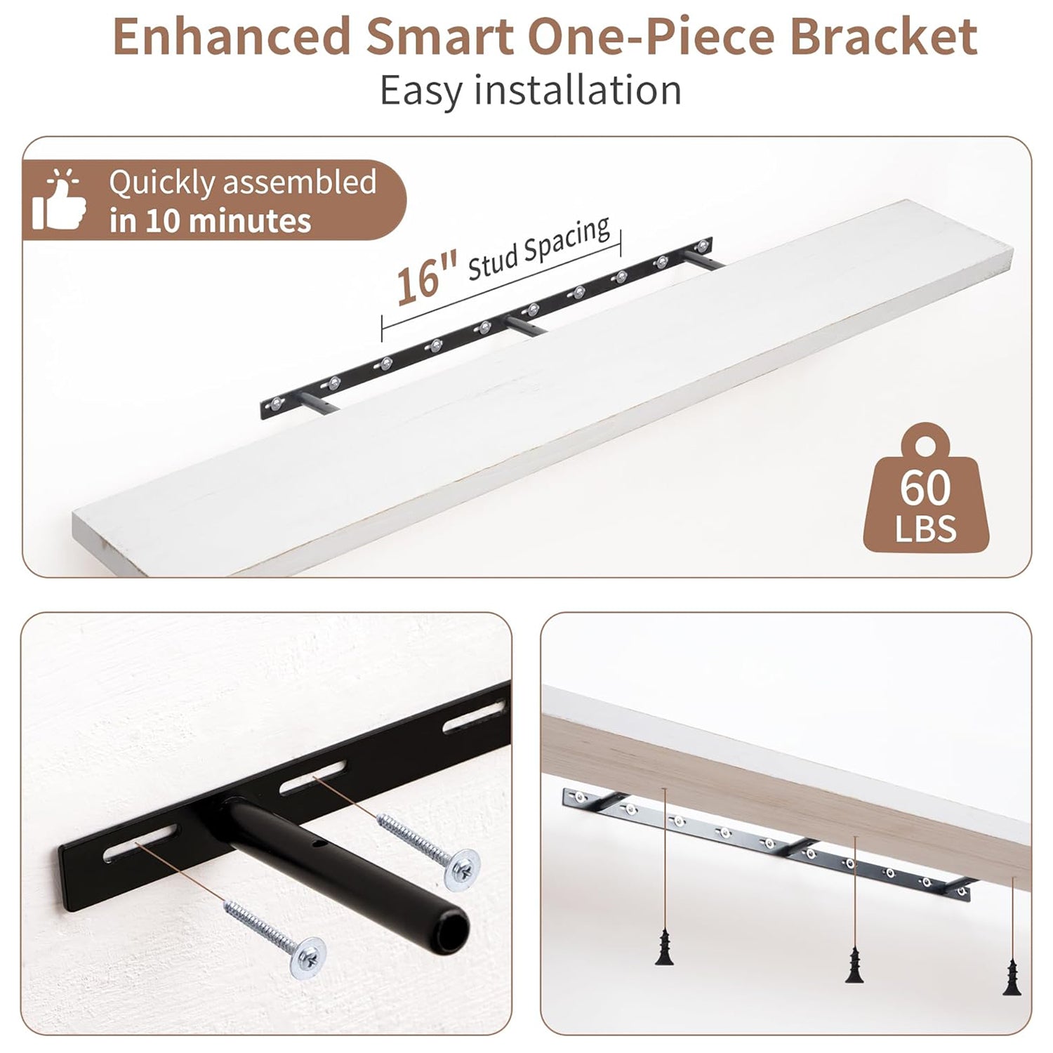 Innovative Mounting System: Equipped with a robust hidden bracket, these shelves are designed for secure installation into wall studs, supporting up to 60 lbs per shelf. The flush mount design conceals the brackets for a seamless look, while bottom screws keep the shelves firmly in place.
