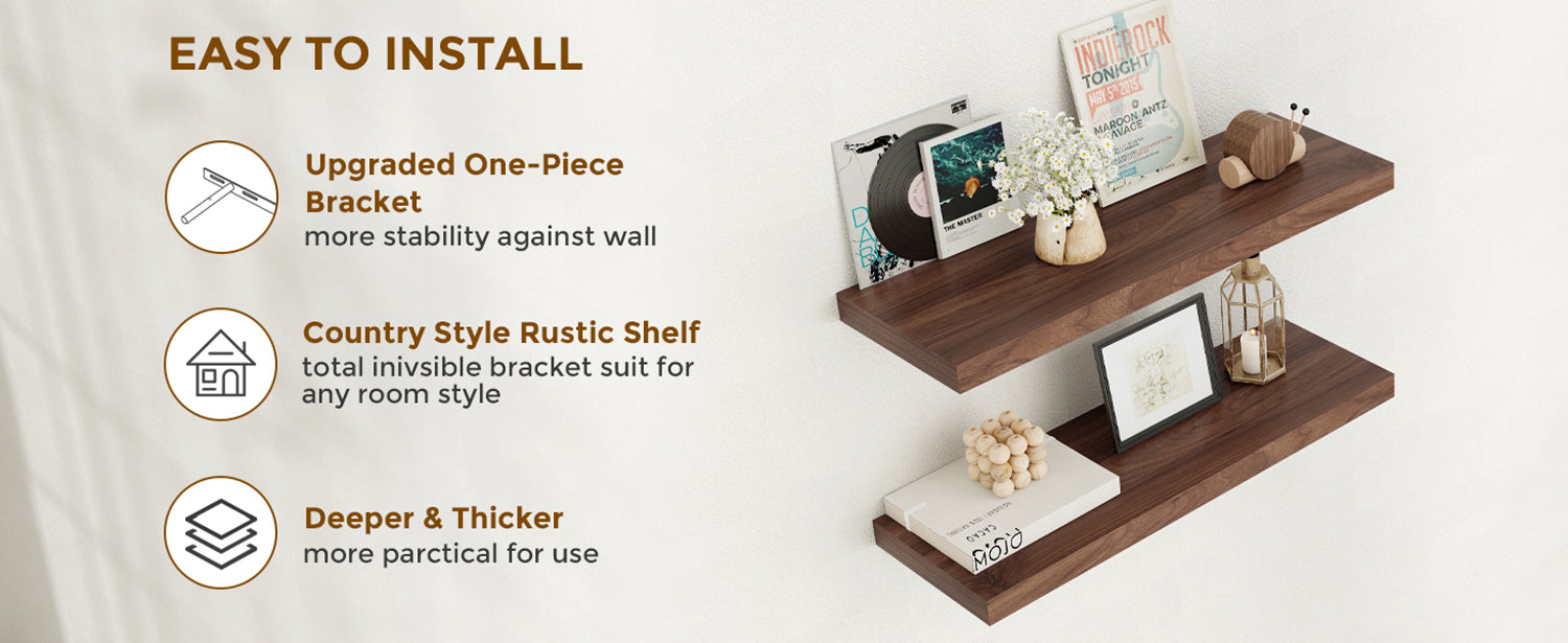 - Farmhouse Rustic Floating Shelf: Crafted from premium engineered wood and supported by an invisible one-piece bracket, these floating shelves add a rustic charm to both modern and traditional interiors. The wood grain surface enhances the warmth and character of your space. Install them at staggered heights or side-by-side for a sleek, streamlined look.