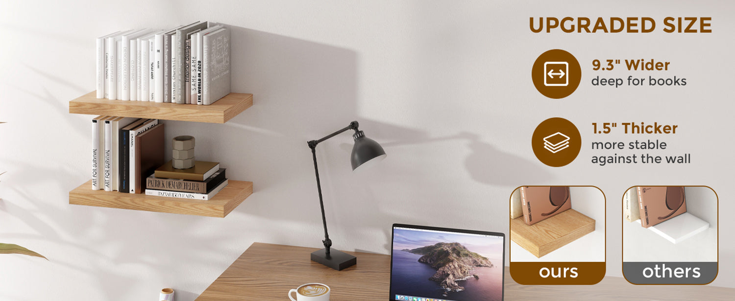 - Extra Deep Floating Shelf – 9.3 Inches: With a depth of 9.3 inches and a thickness of 1.5 inches, these shelves offer more space than typical narrow shelves. Perfect for displaying photos, books, toys, DVDs, and other knickknacks, they’re a beautiful addition to any room.