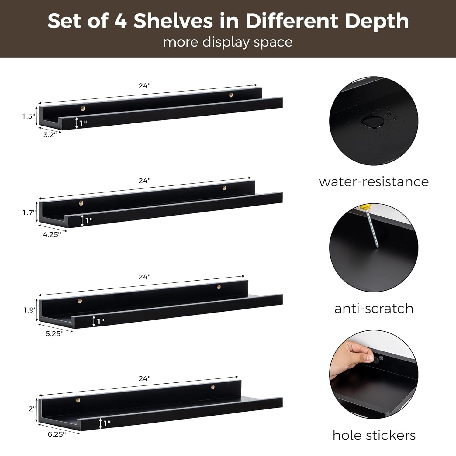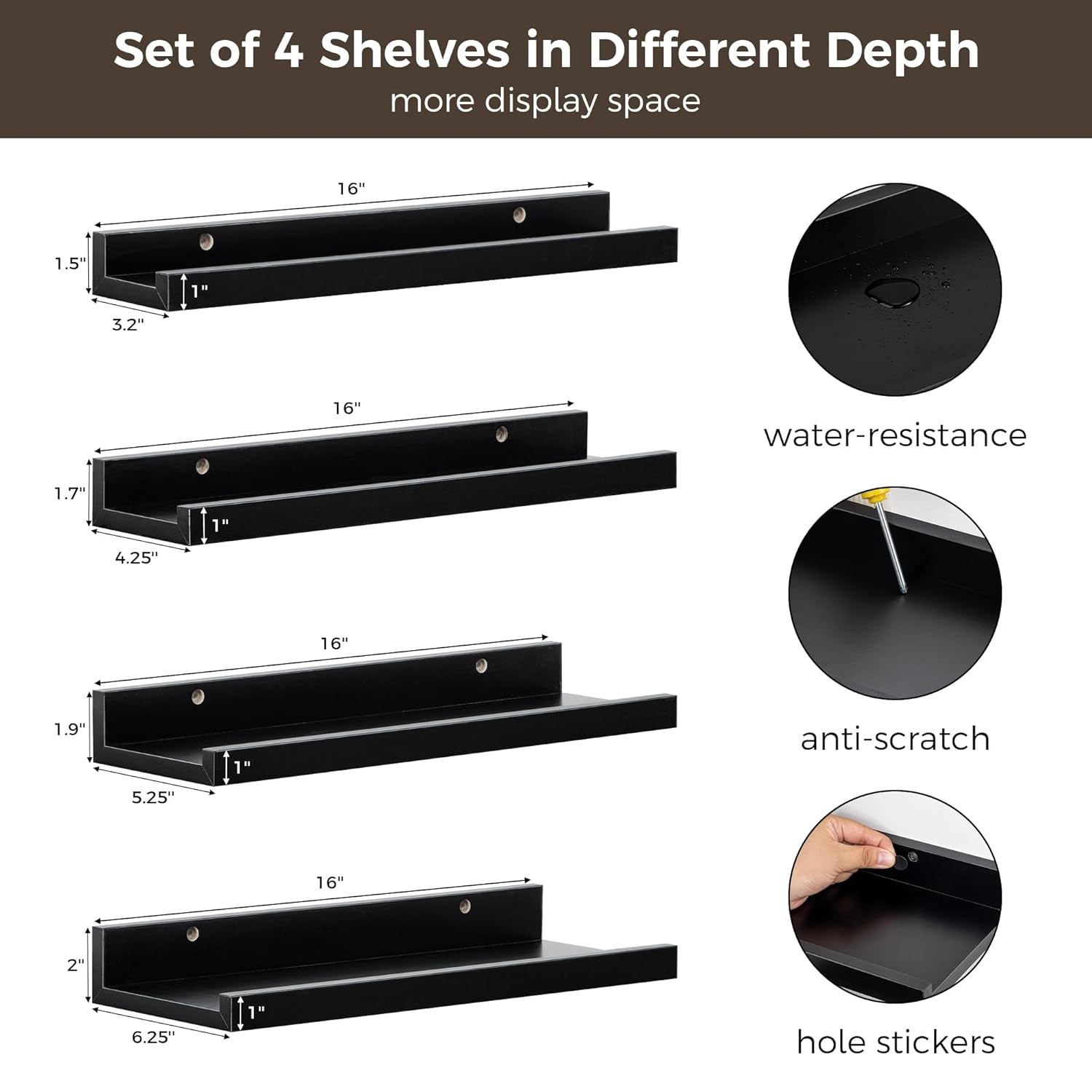 - Built to Last: The picture ledge shelves are designed to last for years to come. Each wood floating wall shelf with different depth is built to be durable with mounting holes, 16 inches apart for secure wall stud installation.