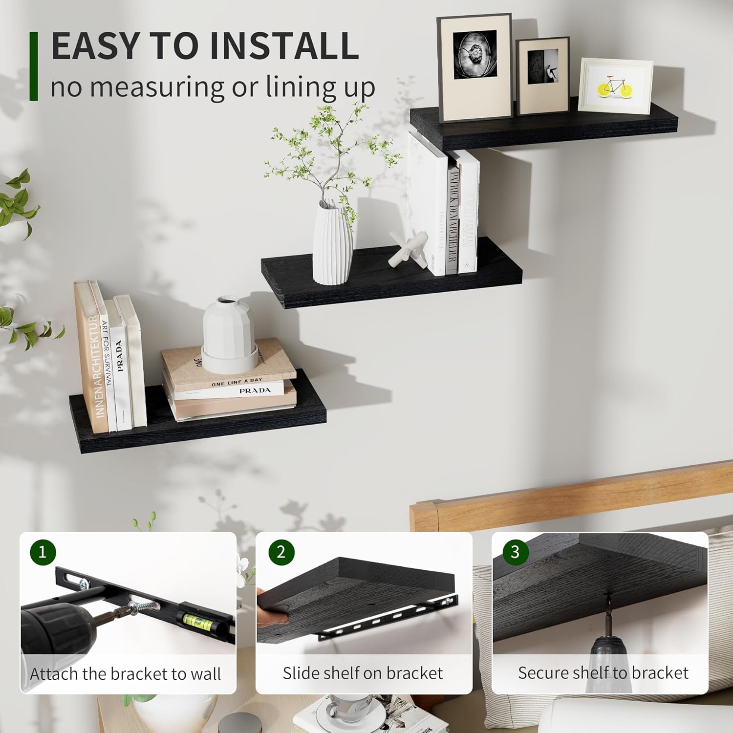 - Effortless Installation: Featuring a T-type bracket for easy mounting, these distressed black shelves come with clear instructions for a hassle-free installation. The hidden bracket design creates a true floating effect, adding elegance to your decor.