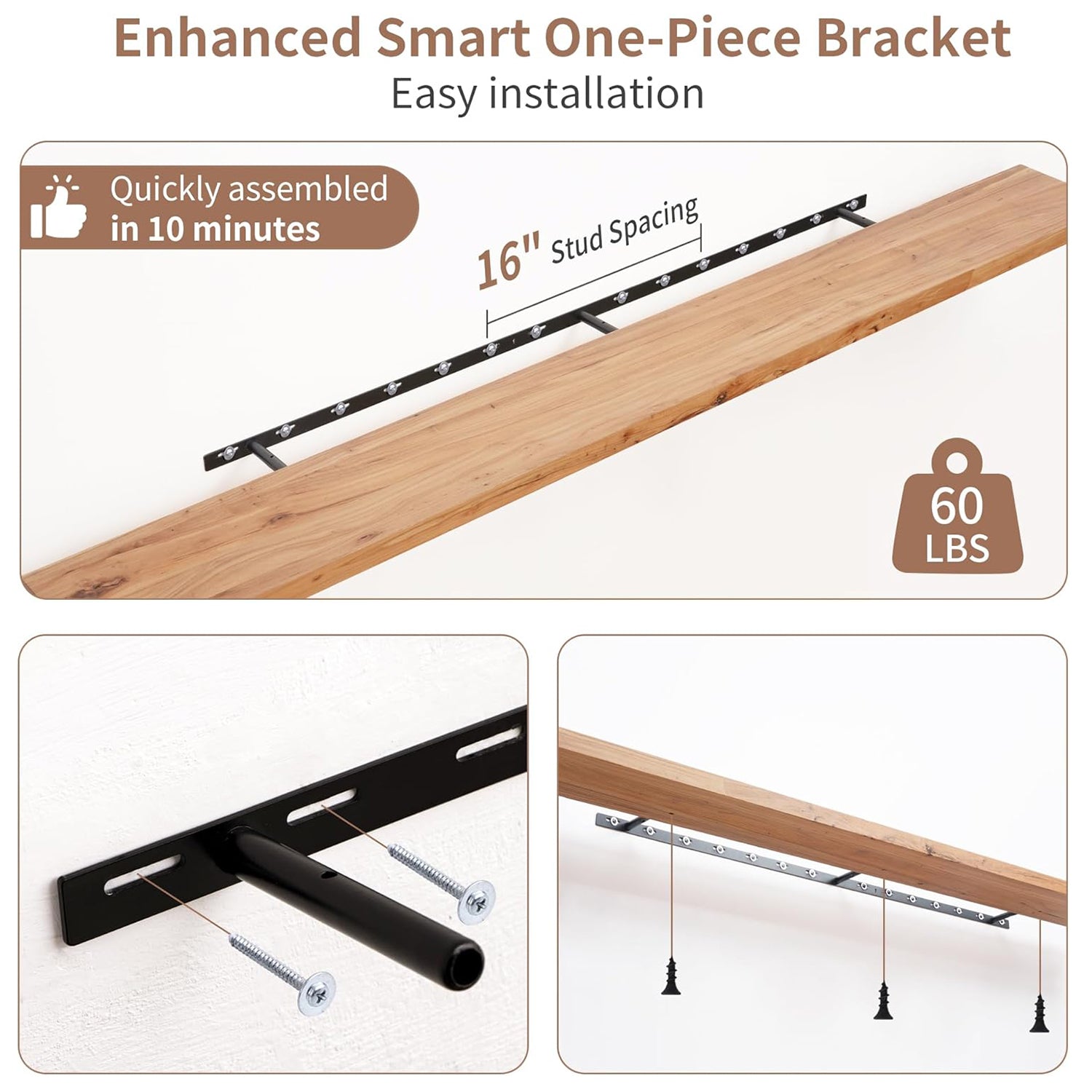 Innovative Mounting System: Equipped with a robust hidden bracket, natural floating shelves are designed for secure installation into wall studs, supporting up to 60 lbs per shelf. The flush mount design conceals the brackets for a seamless look, while bottom screws keep the shelves firmly in place.