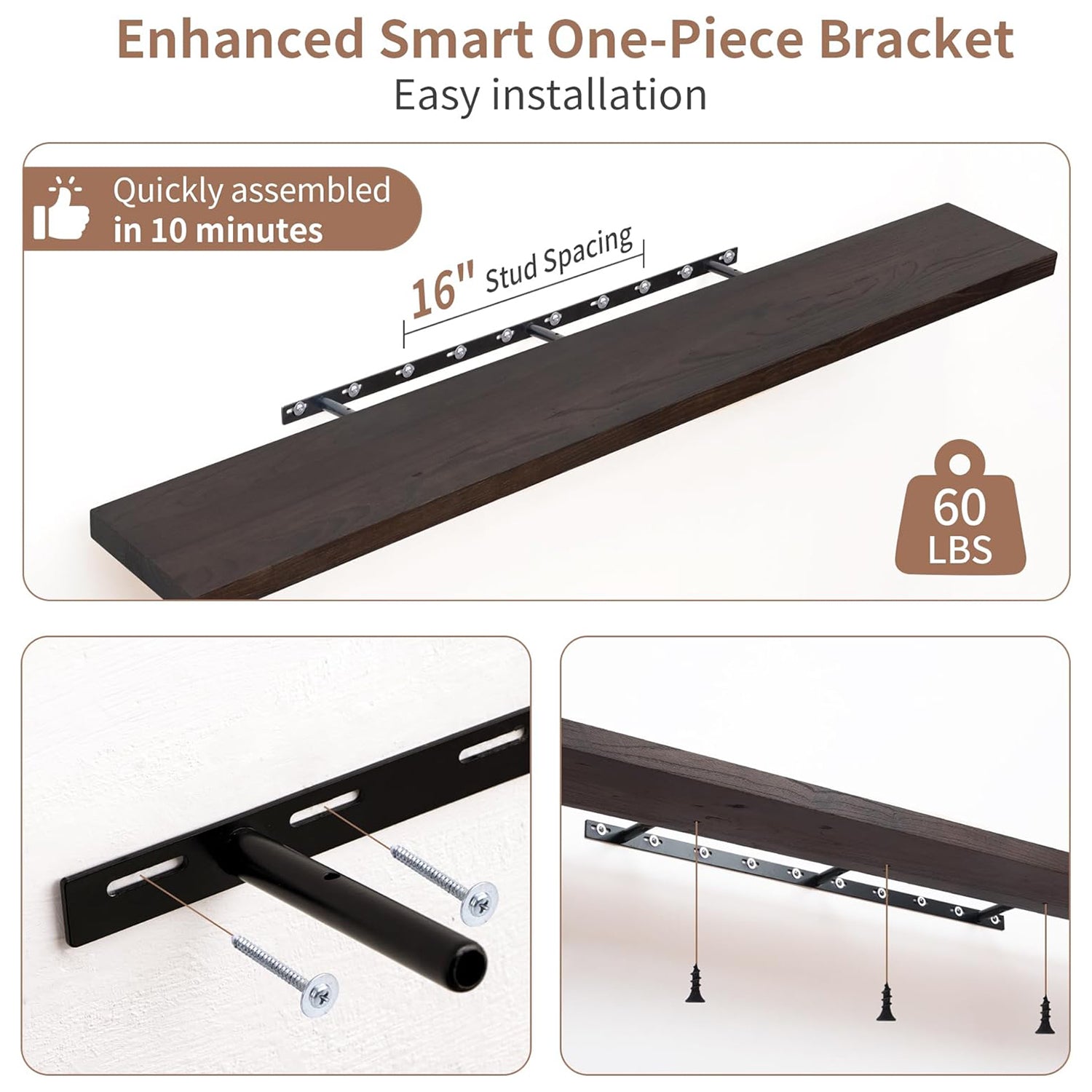 Innovative Mounting System: Equipped with a robust hidden bracket, these walnut floating shelves are designed for secure installation into wall studs, supporting up to 60 lbs per shelf. The flush mount design conceals the brackets for a seamless look, while bottom screws keep the shelves firmly in place.