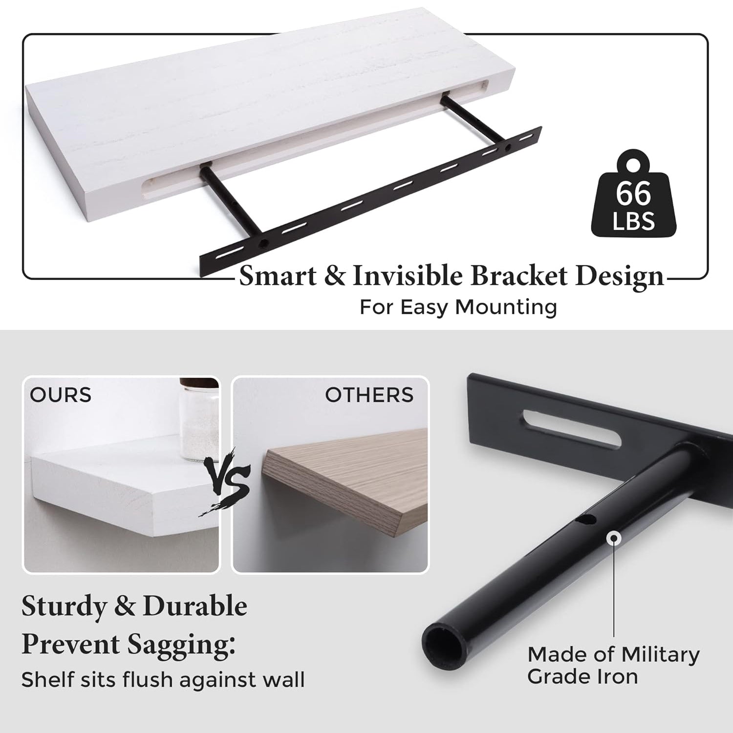 - More Sturdy, Never Sag: They do appear as if they are floating with the concealed mounting hardware. Up to 110 lbs weight capacity, with high quality Solid Paulownia Wood, much stronger than normal floating shelves.