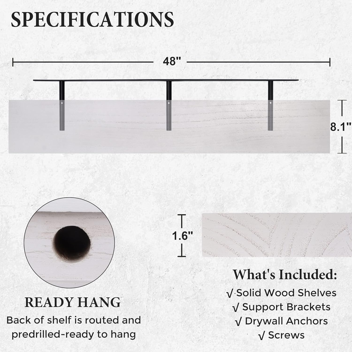 - 8.1" Deep Wall Shelves: This deep wall shelf is 1.6" thick and 8.1" deep instead of the regular narrow floating shelves, you can put photos, pictures, DVD players, videos, books, toys, and some other knickknack on this beautiful display floating shelf.