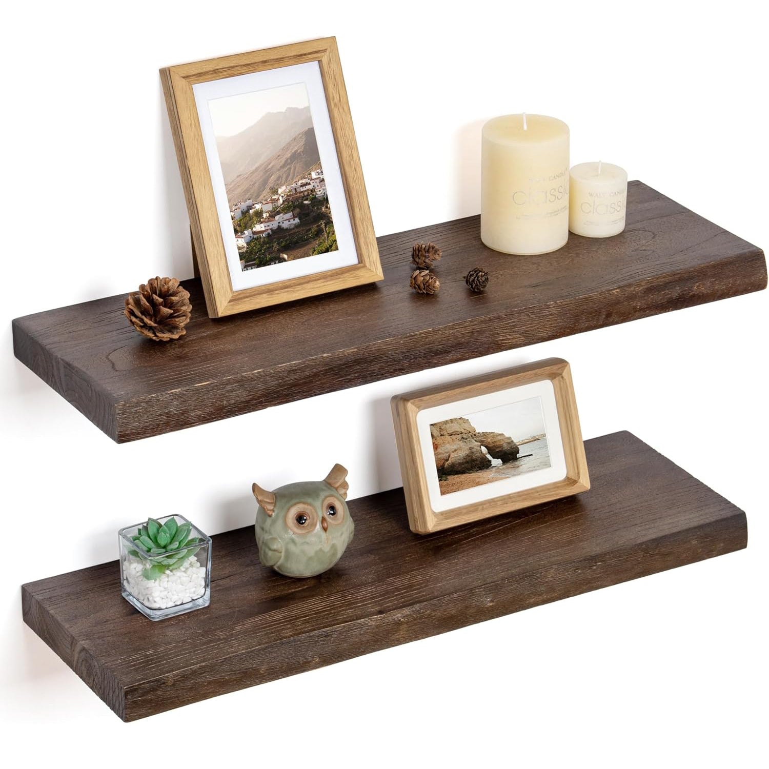 - Solid Elm Wood: Our rustic live edge floating shelves are made of reclaimed elm wood, each floating shelf has a unique natural grain, color, holes, and knots. Don't worry about holes and knots, these are elm itself so you can feel the feeling of nature.
