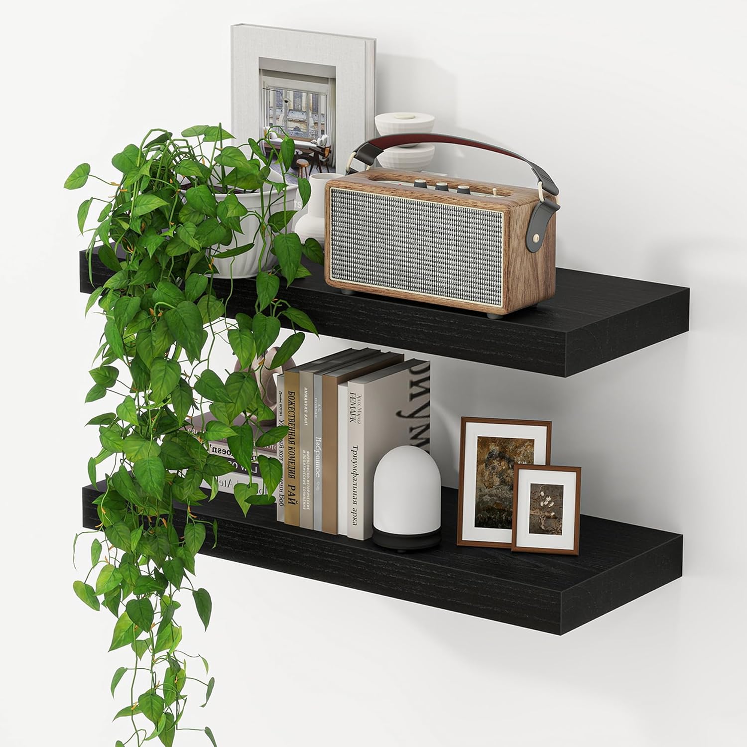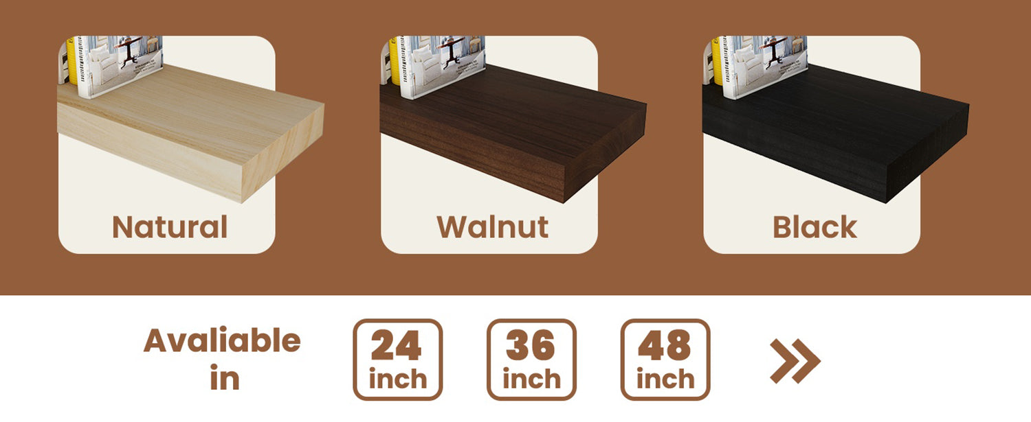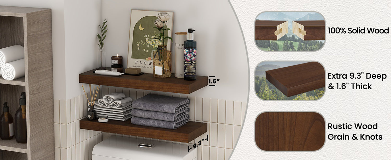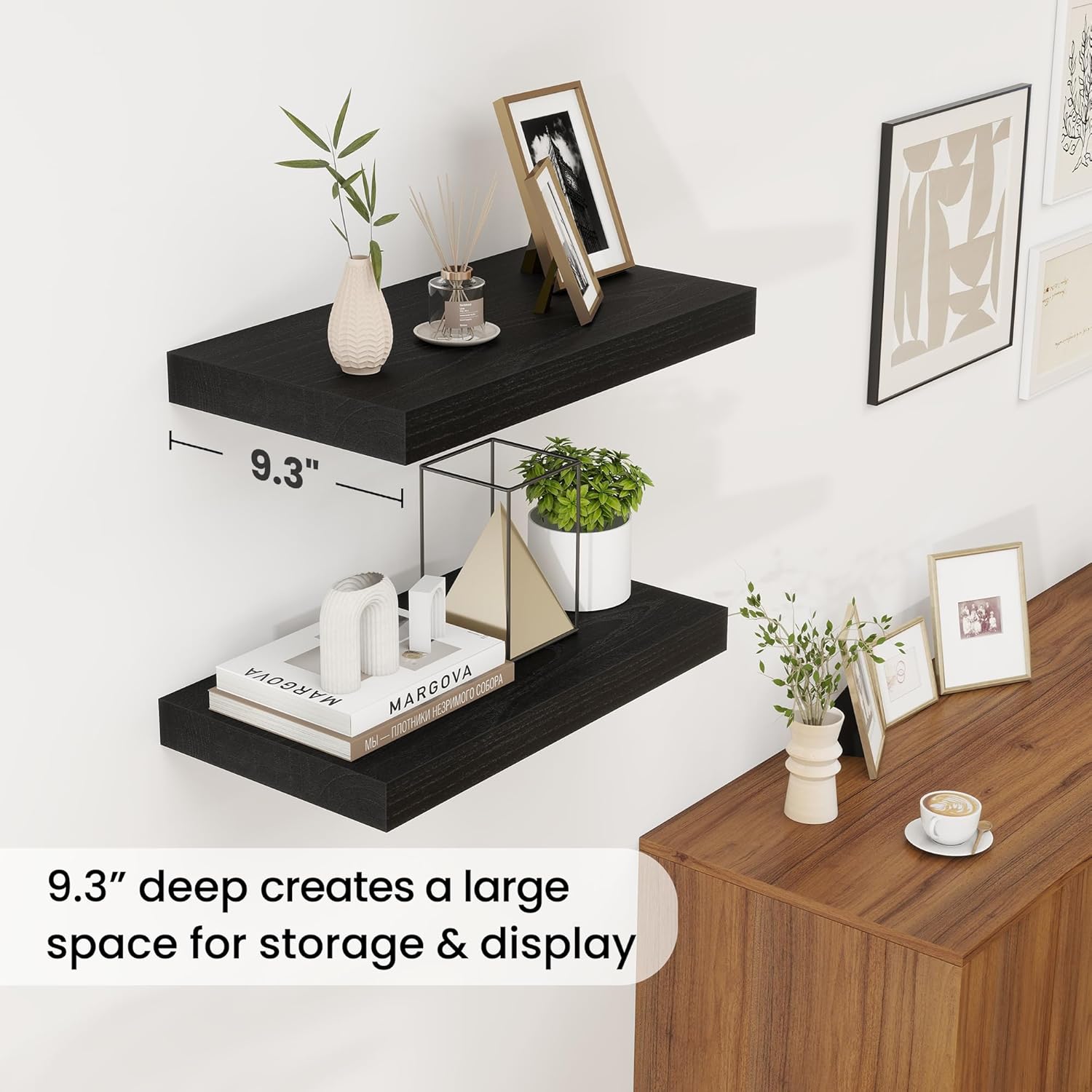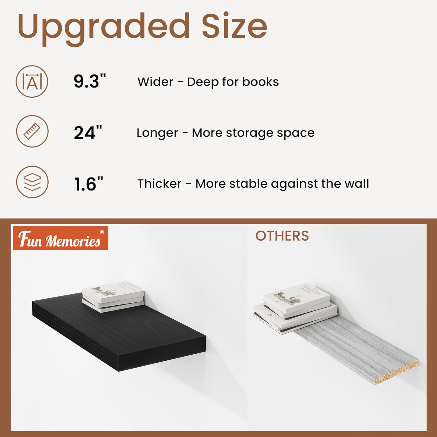 - 【9.3 Inch Deep Floating Shelf】This extra deeper and thicker wall shelves are 9.3 inches in depth and 1.6 inches in thickness instead of the regular narrow floating shelves, you can put photos, pictures, DVD players, videos, books, toys, and some other knickknack on this beautiful display wooden shelf.
