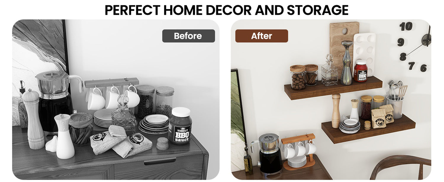 - 【Decrative&Functional】The wall-mounted floating shelves are designed for decoration and storage, utilizing and decorating any space in your home. Used as shelf decor to show your collection, books, or prize, the hanging shelves are perfect for displaying your photo frame, small plants, model, or audio in your living room, office, study. And can also use as over the toilet storage shelf in the bathroom to hold toiletries or used as kitchen shelf to storage condiments.